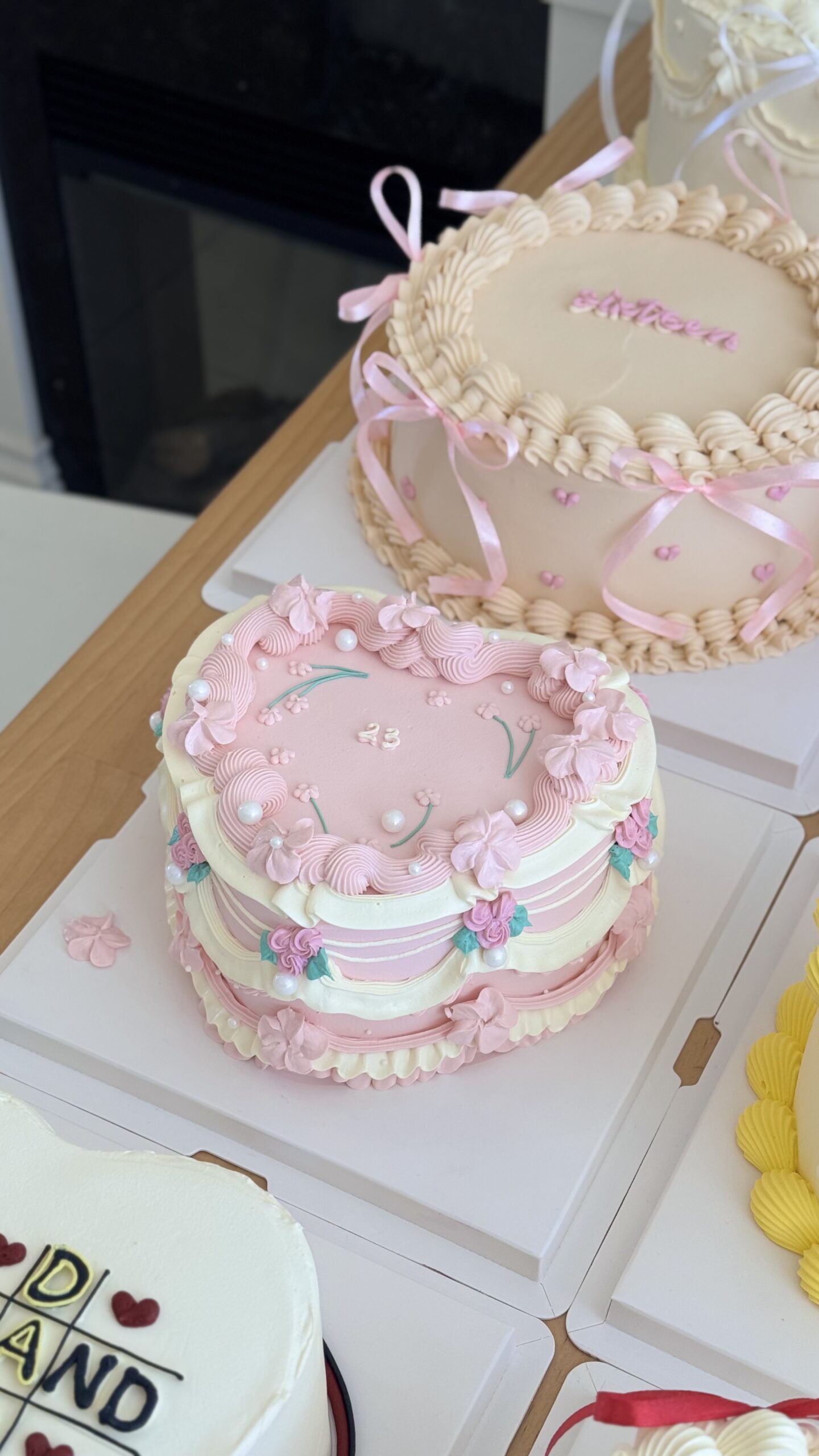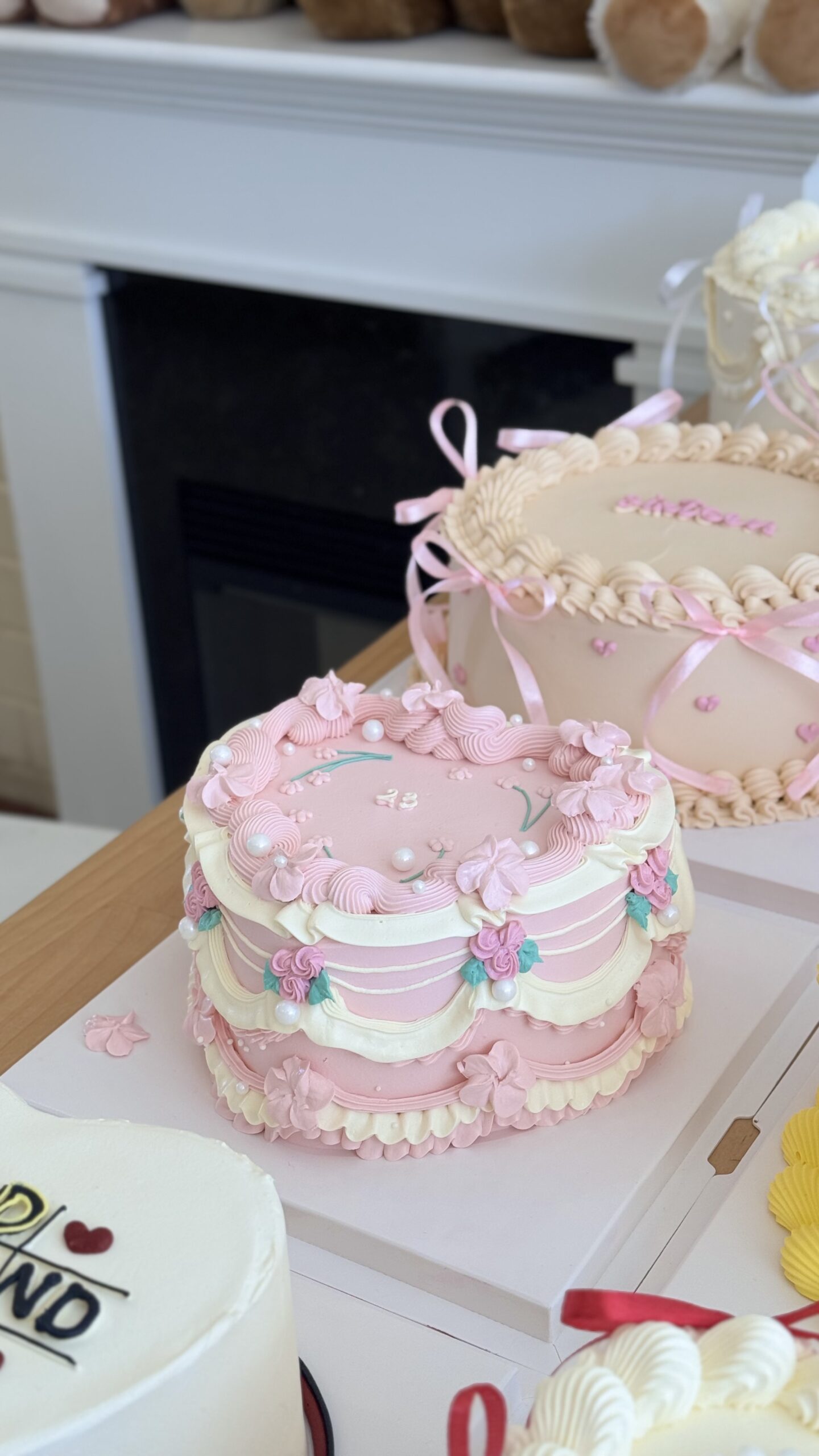A delicate pastel vintage-style cake decorated with layered pink and ivory piping, hand-piped floral details, and soft pearl accents. Sweet, elegant, and perfect for birthdays, bridal showers, and gentle celebrations.