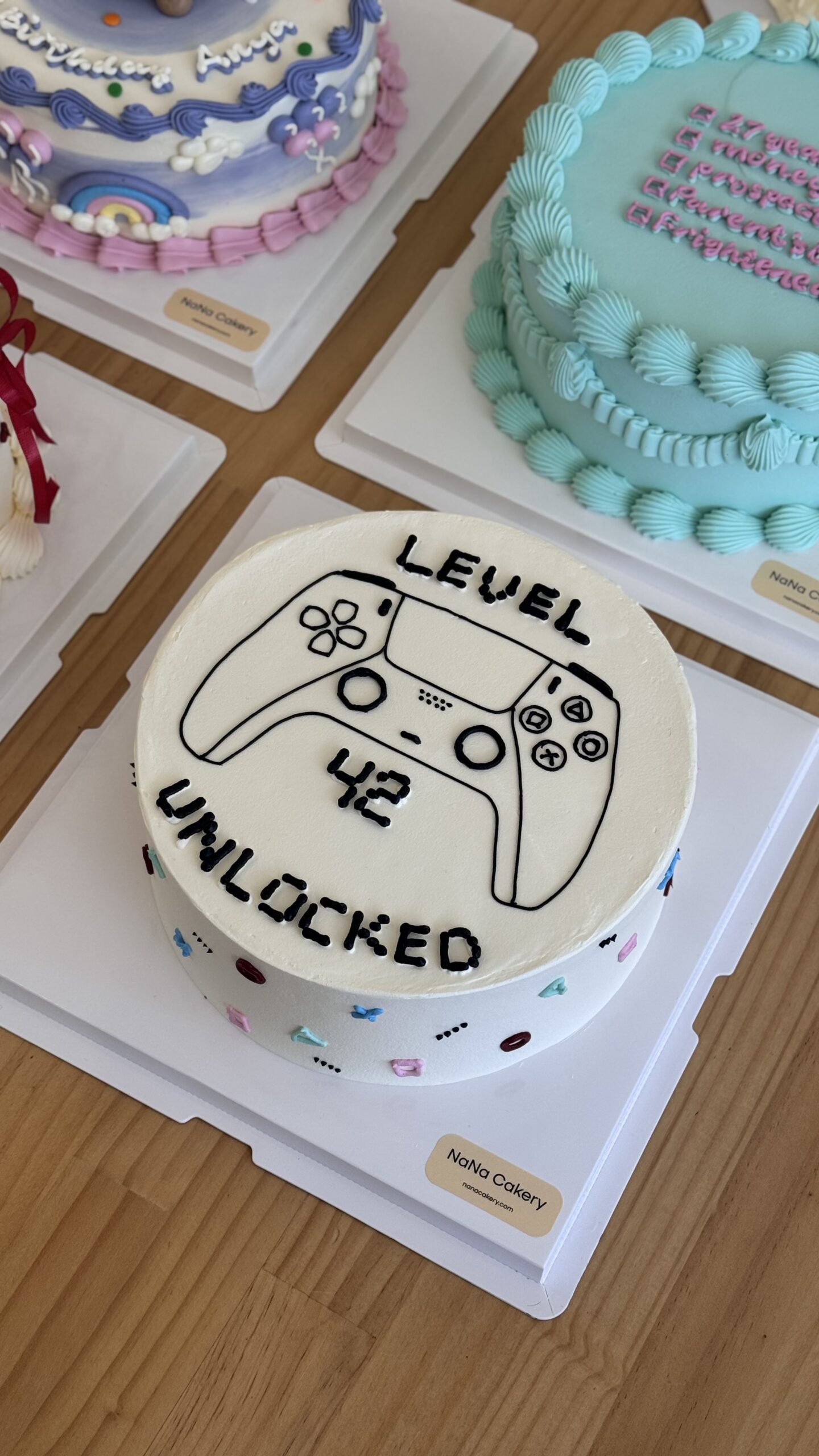 A clean, minimalist cake featuring a hand-piped game controller illustration with custom name and age lettering. Finished with smooth white icing and subtle confetti details around the sides, this cake is perfect for gamers.