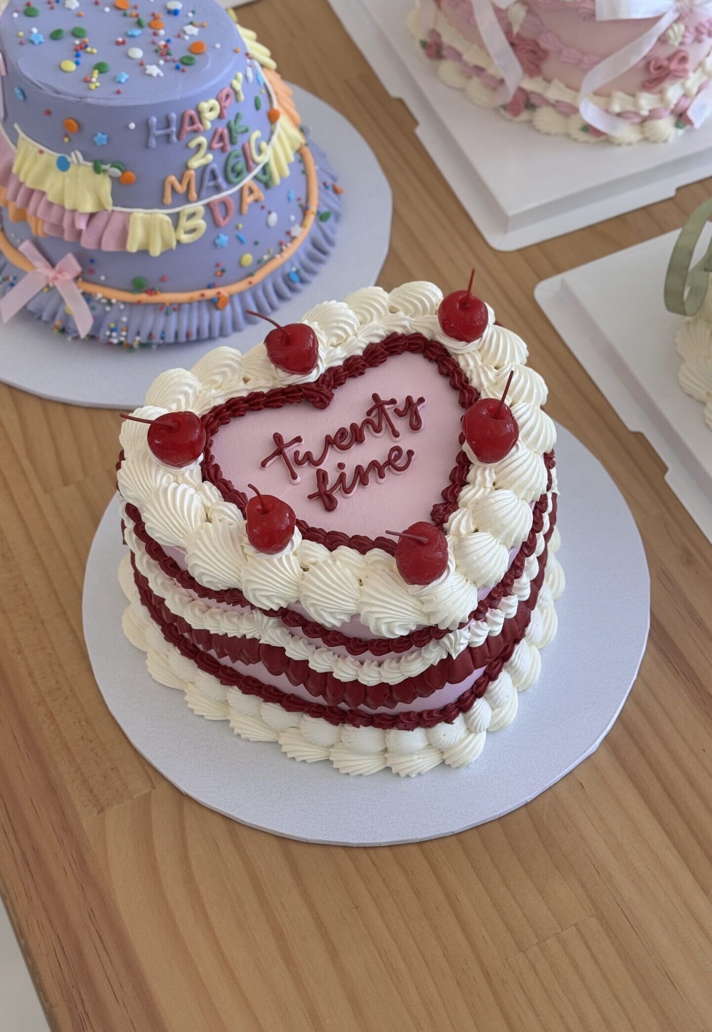 A romantic vintage-style cake featuring soft pink icing, rich cherry red piping, and classic whipped borders. Decorated with bright cherry toppings, this cake is perfect for birthdays, anniversaries, or special celebrations.