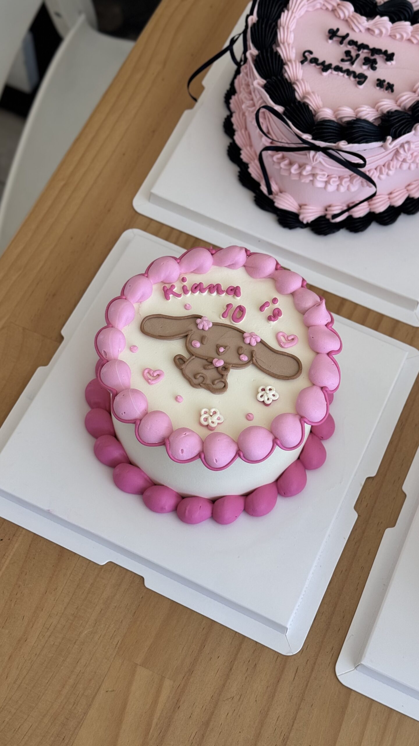 A charming pastel cake decorated with soft pink piping, playful heart details, and an adorable hand-piped mocha sanrio drawing. This cake is perfect for girl’s birthday and sweet celebrations.
